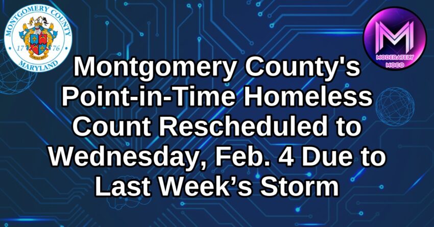 Montgomery County’s annual Point-in-Time (PIT) Count, originally scheduled for January 28, has been rescheduled to Wednesday night, Feb. 4. The count will take place in the overnight hours of Wednesday night. Volunteer orientation begins at 8:30 p.m. at locations in Silver Spring and Gaithersburg.