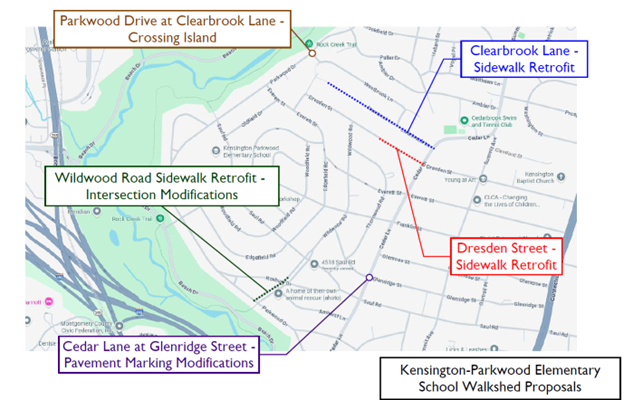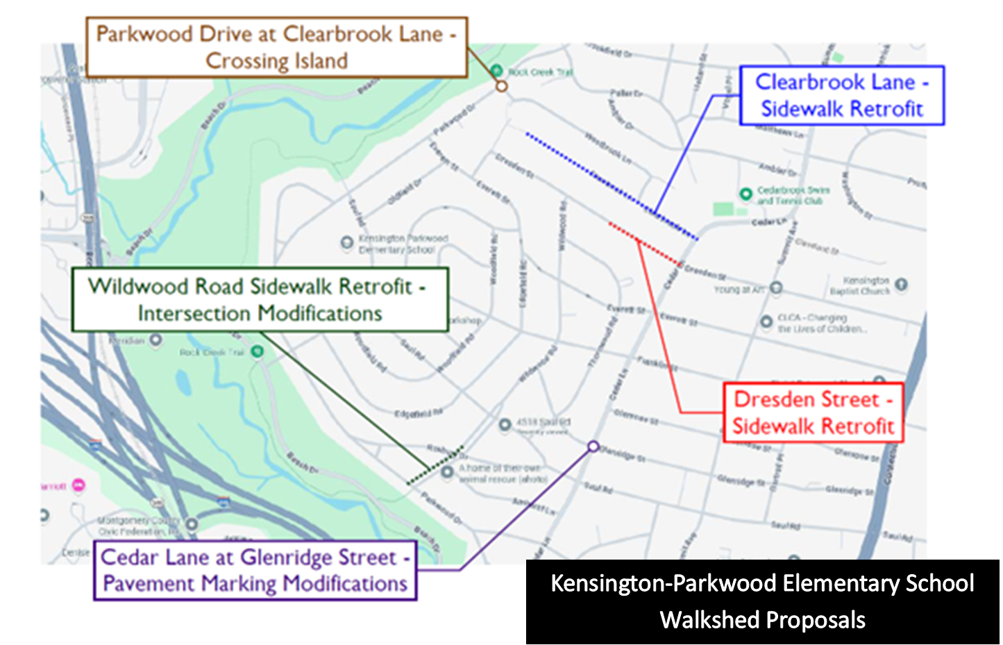 As part of a countywide initiative to identify safe and accessible routes for students walking and bicycling to school, MCDOT completed a walkability study for Kensington Parkwood Elementary School in 2019. The study evaluated existing infrastructure conditions and recommended improvements to enhance pedestrian and bicycle safety and accessibility. In October 2024, MCDOT presented the study’s recommendations to the community. Based on community feedback, the proposed plans have been revised.
