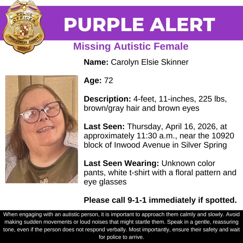 Gaithersburg, MD – Detectives from the Montgomery County Department of Police – 4th District Investigations Division are asking for the public’s assistance in locating Carolyn Elsie Skinner, a missing 72-year-old.