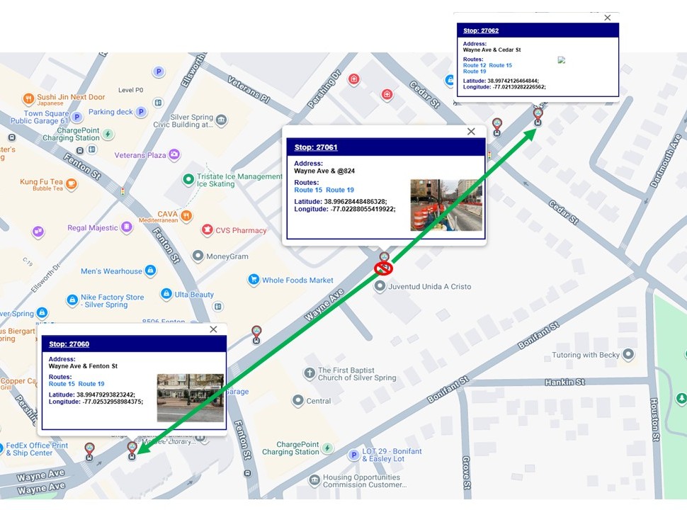 Due to sidewalk construction, a Ride On bus stop on Wayne Avenue, eastbund between Fenton and Cedar Streets (Stop ID – 27061) will be closed on Tuesday, March 24 for two weeks. The bus stop will not serve Ride On routes 12 (Silver Spring-Potomac) and 15 (Silver Spring-Langley Park) during the construction period.