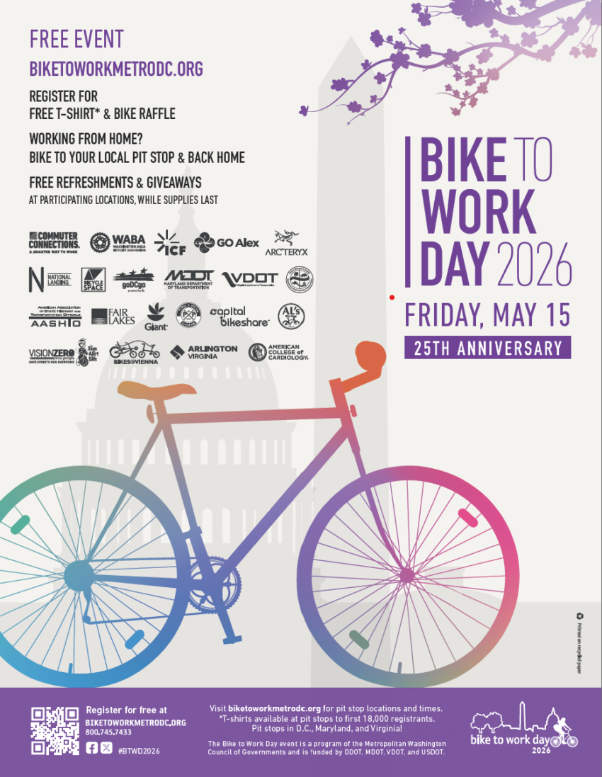 Additional pit stops will be located throughout the Washington region. For more information and a full list of regional pitstops, or to register, visit biketoworkmetrodc.org.