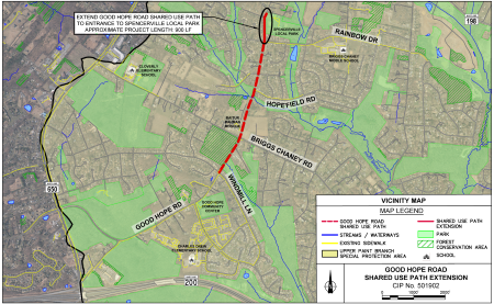 The Good Hope Road Shared-Use Path Extension Project provides an 8-foot-wide shared-use path with a 5-foot-wide grass buffer on the east side of Good Hope Road for approximately 900 linear feet from Rainbow Drive, the northern terminus of the previously installed Good Hope Road Shared Use Path project, to the entrance to Spencerville Local Park.