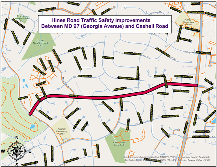 On Thursday, March 26, at 7 p.m., Montgomery County Department of Transportation (MCDOT) will hold a virtual public meeting to discuss proposed safety improvements along a 1.3 mile stretch of Hines Road between Georgia Avenue (MD 97) and Cashell Road in Olney. During the meeting, MCDOT will share the proposed traffic safety improvements, answer questions, and gather public feedback.