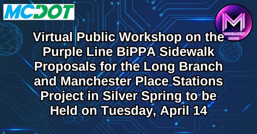 On Tuesday, April 14, at 6:30 p.m., the Montgomery County Department of Transportation (MCDOT) will hold a virtual public workshop (online only) to discuss the proposed Purple Line Bicycle and Pedestrian Priority Area (BiPPA) Sidewalk Proposals for the Long Branch and Manchester Place Stations project in Silver Spring. The public will have an opportunity to provide comments and ask questions.
